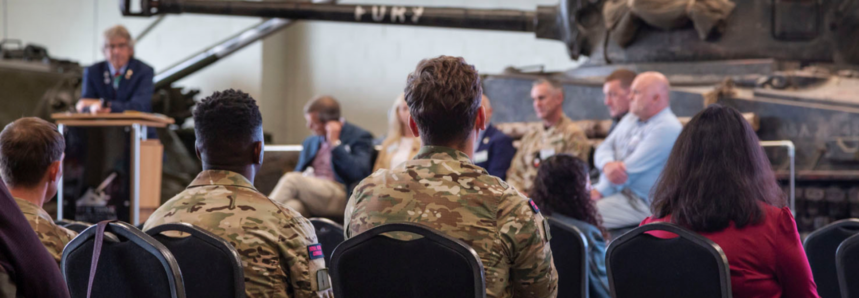 Full colour interior picture. Picture shows people sat in front of desks, facing a speaker and screen with tanks lined up to the left.